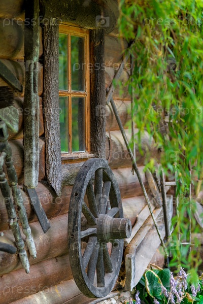 Колесо старой телеги и деревянный дом