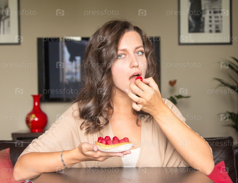 Женщина ест торт с малиной