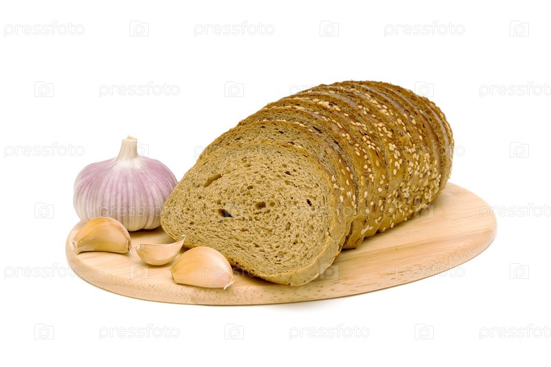 Свежий хлеб и чеснок на белом фоне