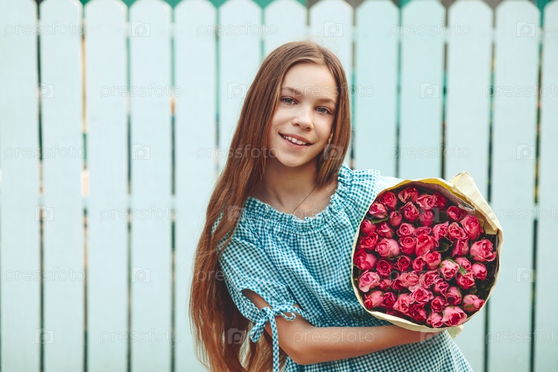 Девочка держит букет роз