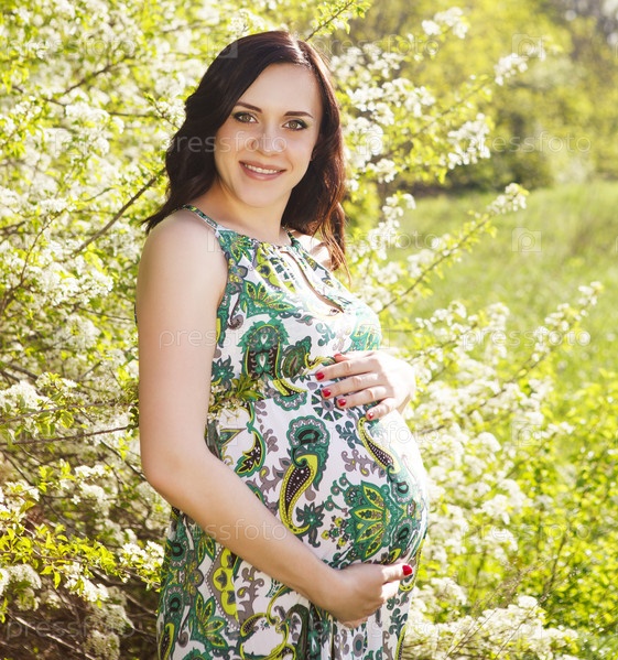 Красивая беременная женщина в зеленом платье