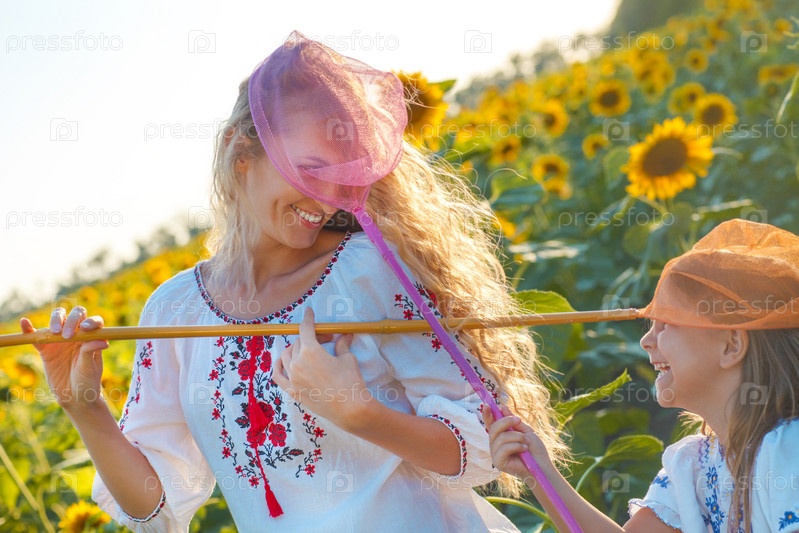 Веселая мама и дочь в поле