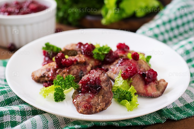 Куриная печень с клюквенным соусом и салатом