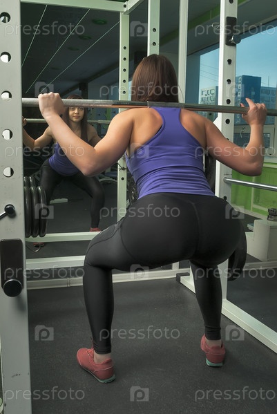 Девушка выполняет приседания со штангой