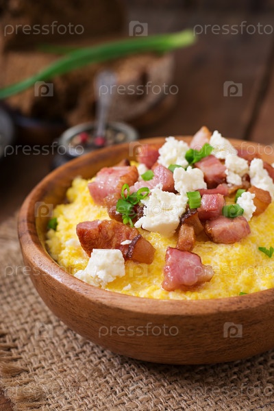 Кукурузная каша с беконом, шкварками и сыром