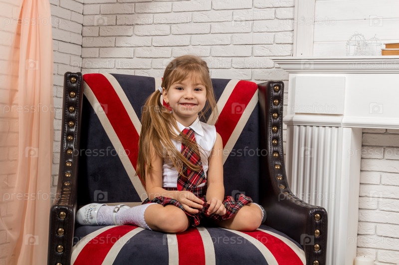 Девочка сидит на стуле с британским флагом