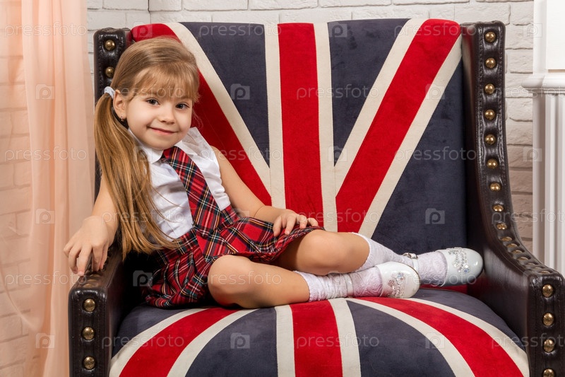 Девочка сидит на стуле с британским флагом