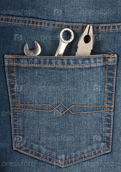 Плоскогубцы и гаечные ключи в кармане джинсов