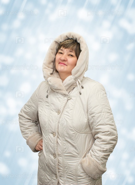 Улыбающаяся женщина в белом пуховике на синем фоне