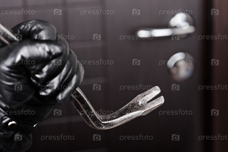Преступность. рука вора с металлическим ломом у закрытой двери