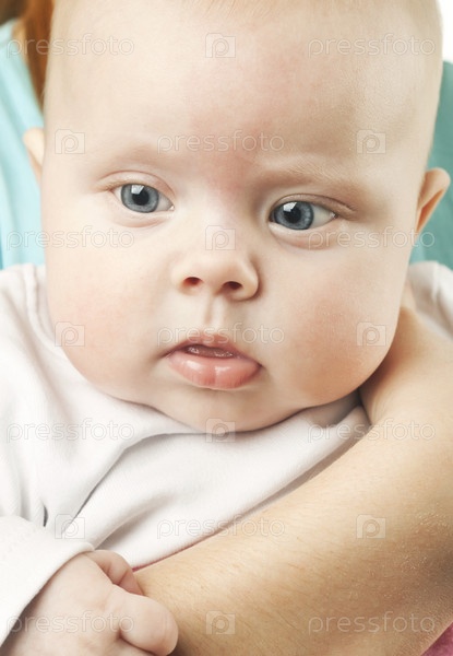 Маленькая голубоглазая девочка на руках у матери