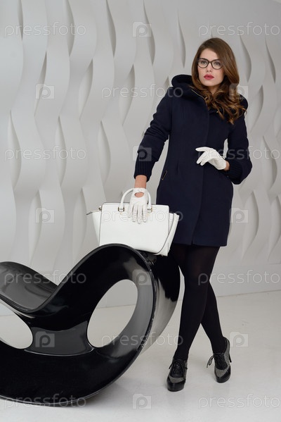 Девушка в студии, позирует в пальто