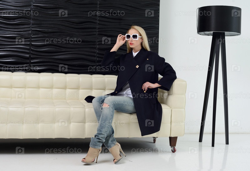 Девушка в студии, позирует в пальто