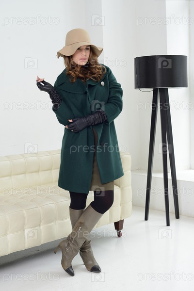 Девушка в студии, позирует в пальто