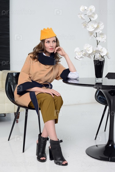 Девушка в студии, позирует в пальто