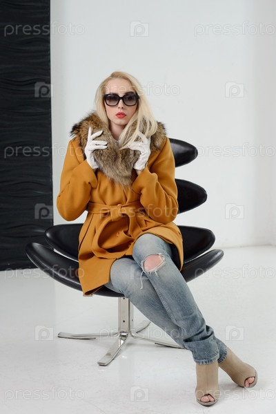 Девушка в студии, позирует в пальто