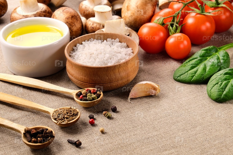 Различные специи, соль, растительное масло, помидоры, грибы, шпинат и чеснок