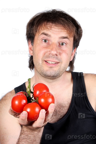 Небритый мужчина в майке держит ветку помидоров