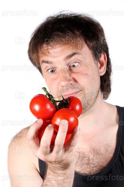 Небритый мужчина в майке держит ветку помидоров