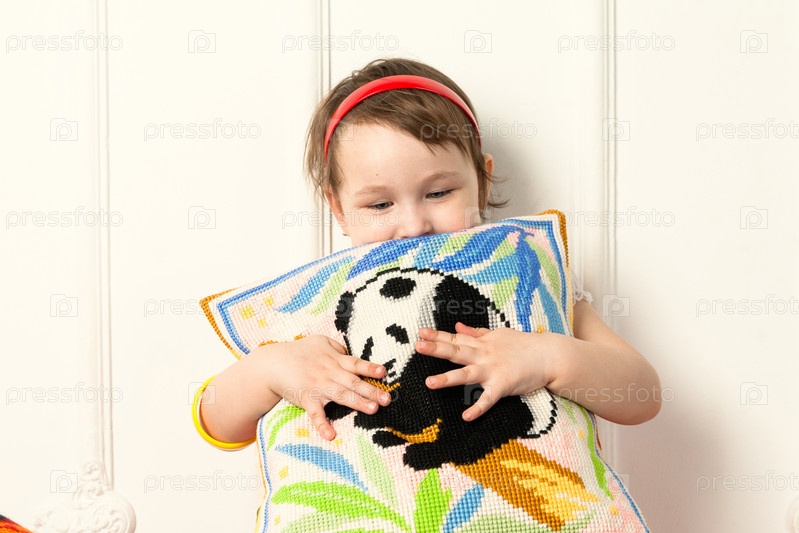 Девочка сидит с подушкой