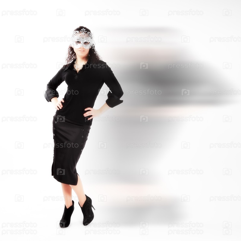 Девушка в черном костюме и маске на белом фоне с тенью