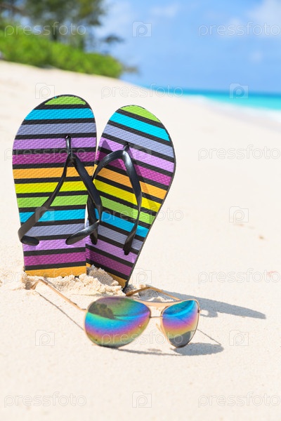 Разноцветные шлепанцы и очки на солнечном пляже