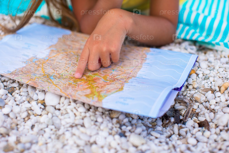 Девочка изучает карту на пляже