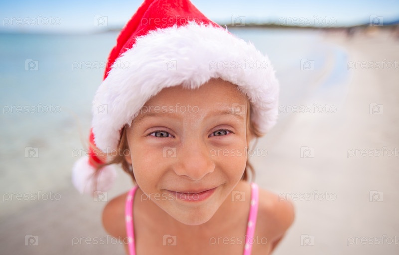 Маленькая девочка в рождественской шапке на пляже