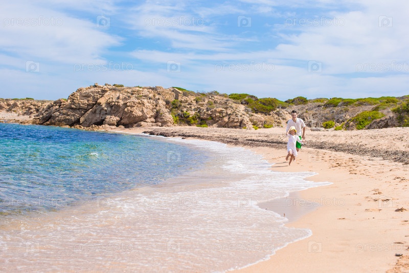 Счастливый отец и дочь бегут по пляжу