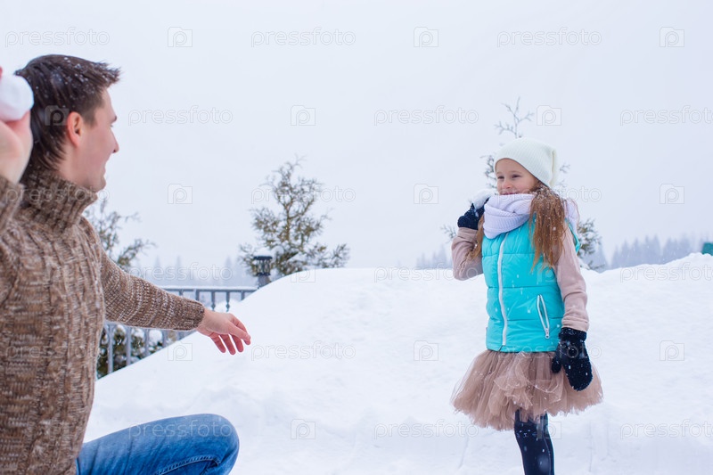 Счастливый отец и дочь играют в снежки