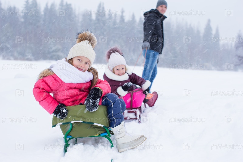 Отец катает дочек на санках
