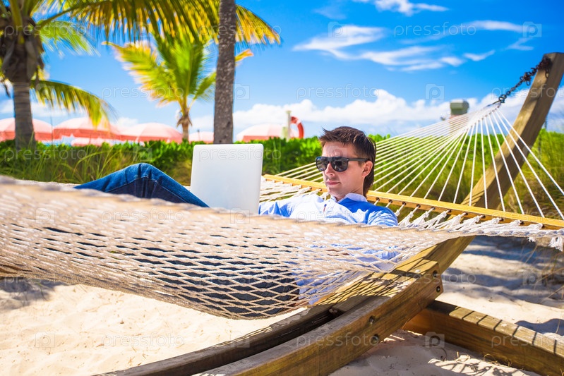 Молодой человек в гамаке с ноутбуком