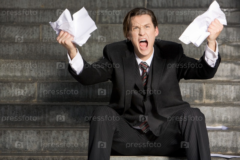 Фото кричащего бизнесмена с двумя листами бумаги в руках