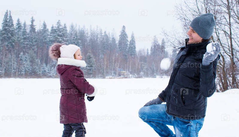 Отец с дочерью играют в снежки