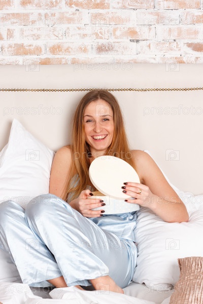 Молодая женщина в постели с коробкой в руках