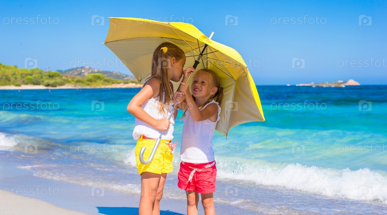 Маленькие девочки с желтым зонтом на пляже