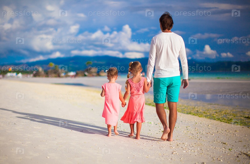 Отец гуляет с дочерьми на пляже