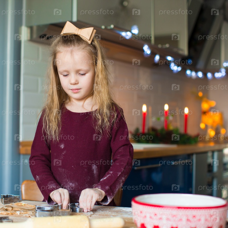 Маленькая девочка готовит тесто для рождественского печенья