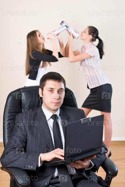 Деловой человек с ноутбуком и две девушки на заднем плане