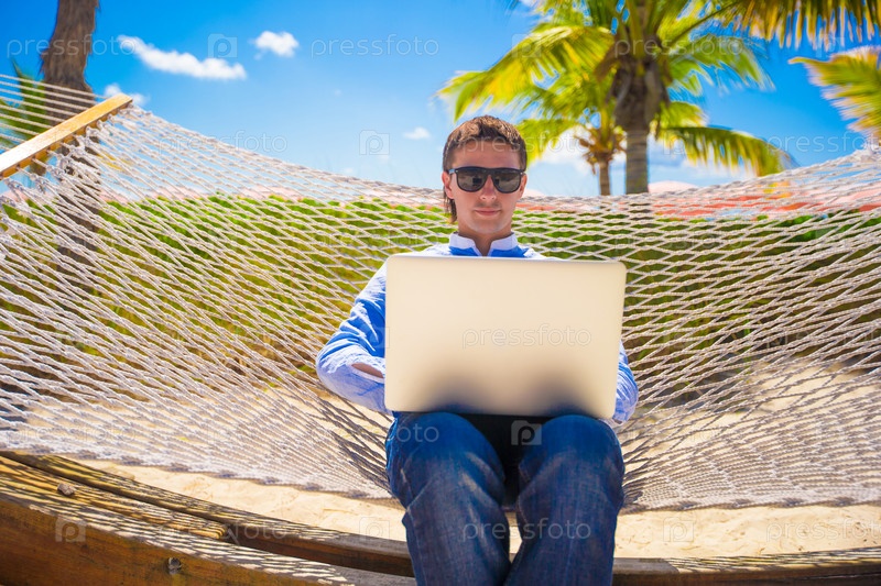 Молодой человек сидит в гамаке с ноутбуком