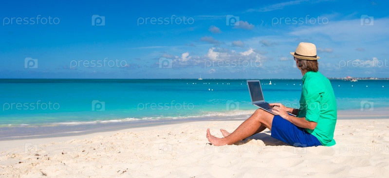Молодой человек с ноутбуком на пляже