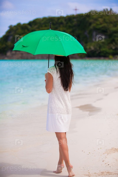 Молодая девушка с зонтом на белом пляже