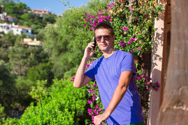 Молодой человек разговаривает по телефону на балконе
