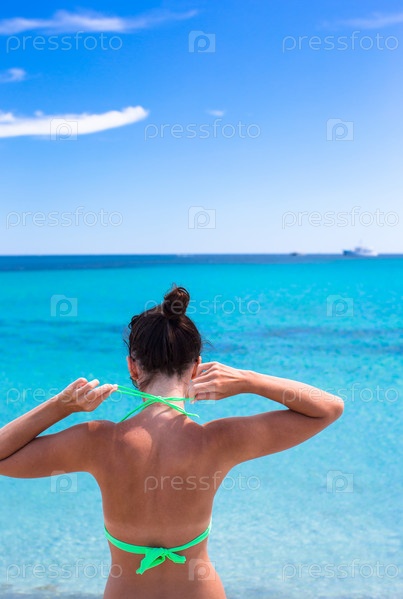 Молодая красивая девушка завязывает купальник