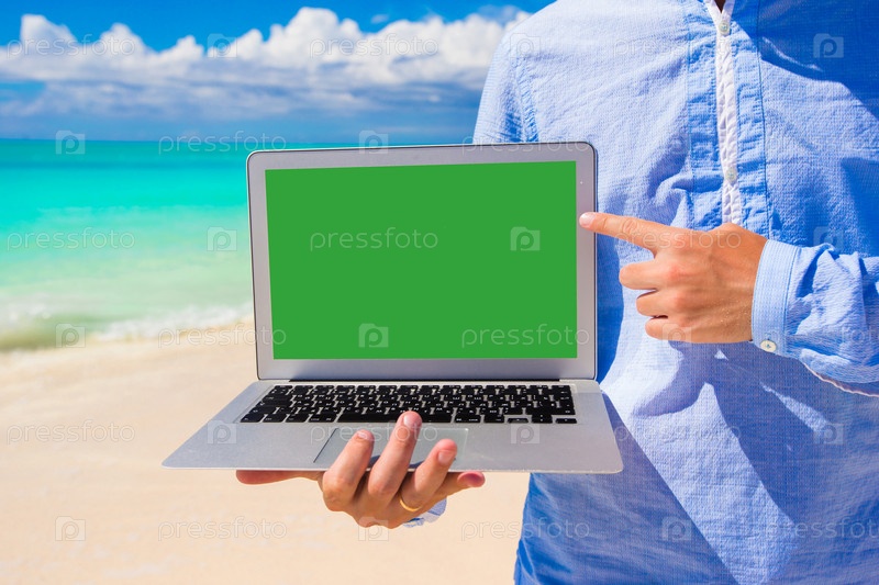 Молодой человек с ноутбуком на пляже
