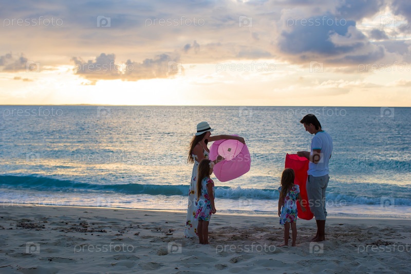 Семья запускает китайские фонарики на пляже