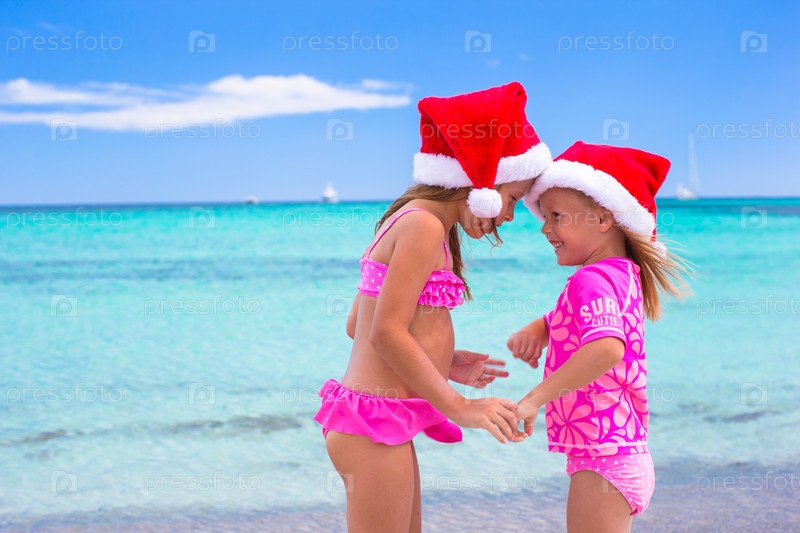 Счастливые сестренки встречают Рождество на пляже