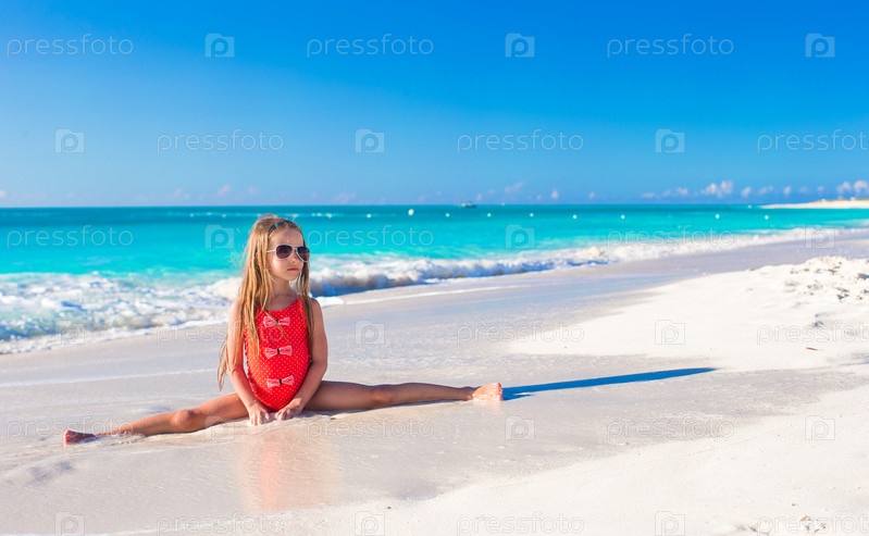 Девочка сидит на шпагате на пляже