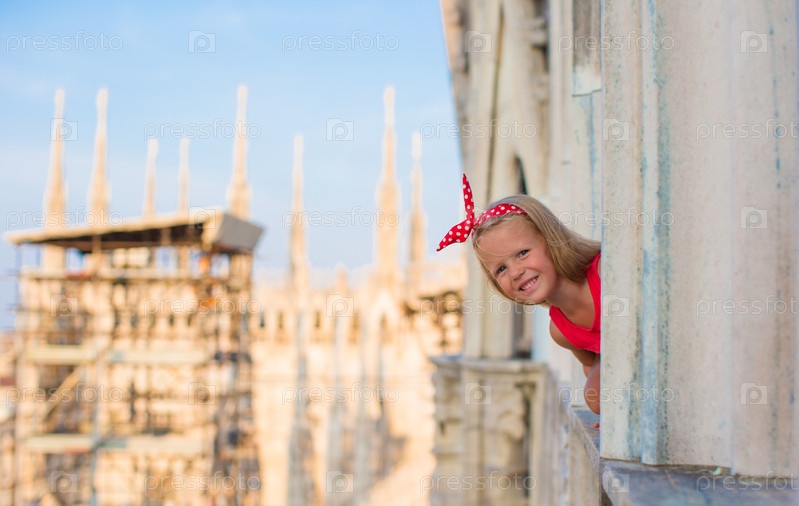 Очаровательная девочка выглядывает из окна