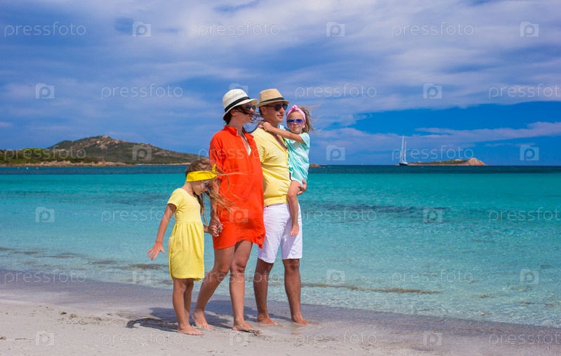 Счастливая семья прогуливается по пляжу